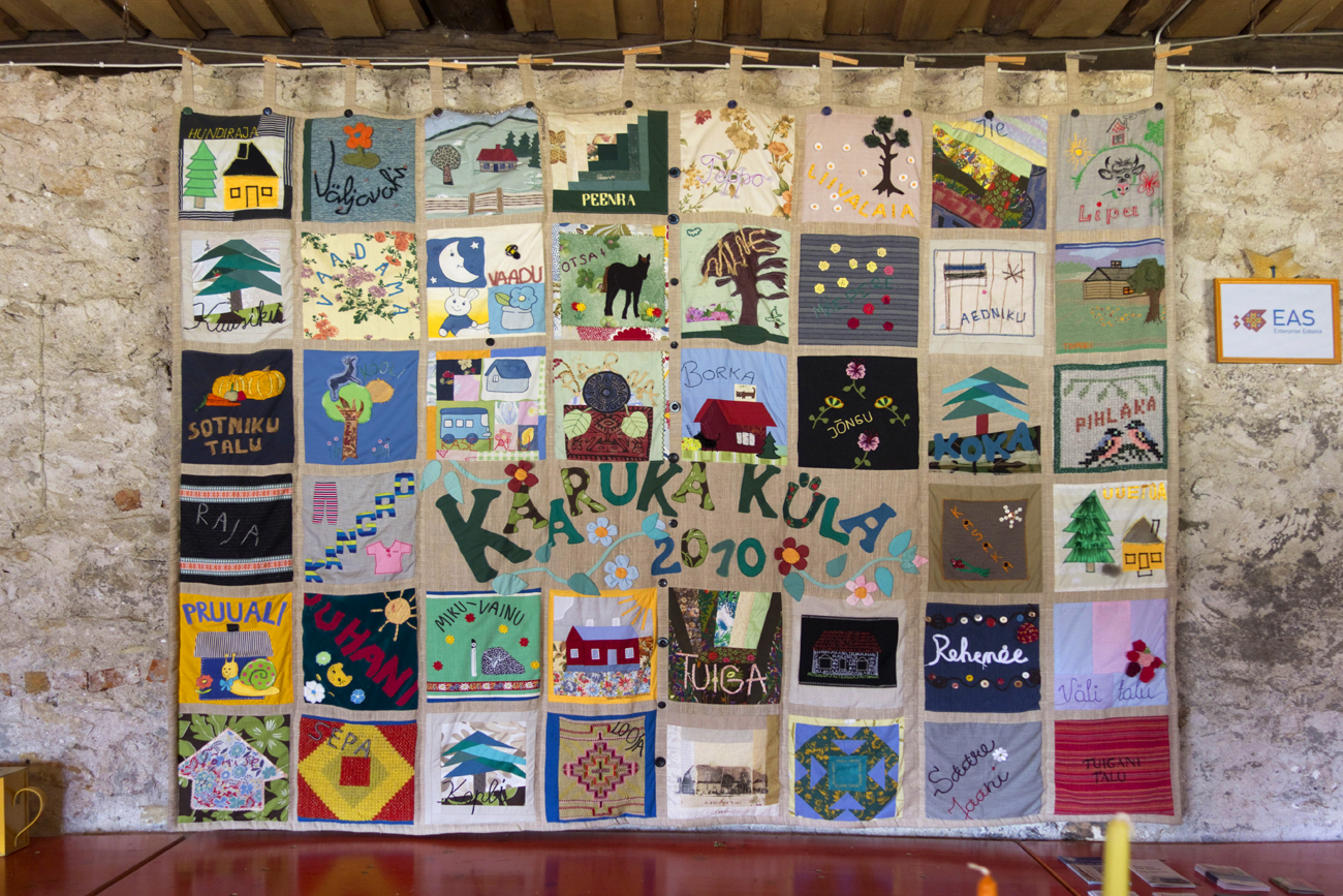 Külamaja seinal ripub küla naiste õmmeldud suur lapitekk, mille iga lapp jutustab ühe talu loo.