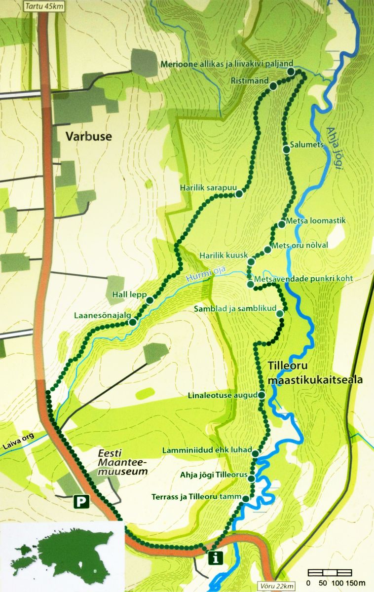 TILLEORU MATKARADA algab vana maanteesilla juures, kulgeb Ahja jõe kaldal Merioone allikani, sealt viib oruveerust üles ja edasi piki Hurmi oja kaldaäärset. Kaitseala mitmekesise looduse ja liigirohke taimestiku kohta saab mõndagi teada rajale paigutatud infotahvlitelt. Mets matkaraja ümber on põnev ja eripalgeline – palumets vaheldub kuusikuga, oruveerudel kasvavad vanad võimsad tammed.