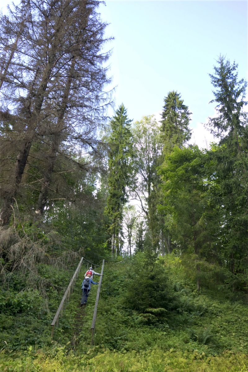 Värskendame allikaveega silmnägu ja ronime järsust rinnakust üles. Matkaraja äärde jääb seitsmeharuline Erastvere ristimänd. Vanasti läinud siit tee, mida mööda viidi lahkunuid kalmistule. Puu sisse lõigati rist, mis pidi keelama surnut kodukäijana tagasi tulemast.